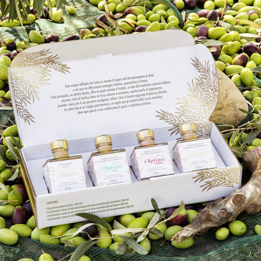 La nostra box rappresenta un’esperienza culinaria unica, offrendo quattro boccette da 100 ml ciascuna di olio extravergine di oliva pregiato. Ogni boccetta racchiude una variante deliziosamente aromatizzata, che esalta ulteriormente il profilo gustativo dell’olio extravergine di oliva.